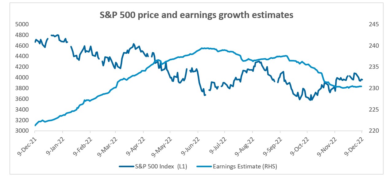 Consensus estimates for next year’s earnings growth for S&P 500 companies have gradually been revised lower since July. Earnings estimates have fallen from over 11% to 5.3% for 2023. Further downward revisions are likely as corporate profitability comes under pressure from lower consumer demand, higher input costs and higher labour costs, resulting in lower output prices and shrinking profit margins. Earnings estimates of companies in Europe Stoxx 600 have also been revised lower, which is in contrast to the Asia Pacific region, India in particular, which has shown upward revisions to company earnings estimates.