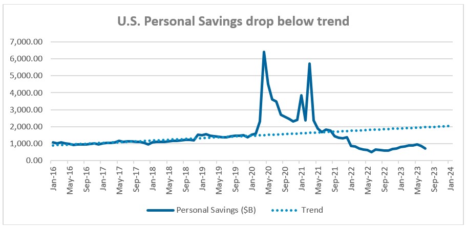 Long bond yields have steadily pushed higher over the past few months even as inflation in the U.S. has fallen from around 9% to just above 3% over the last year. The yield on the 10-year Treasury continued to move up in August, reflecting an ongoing reassessment of the long-run neutral rate of interest.