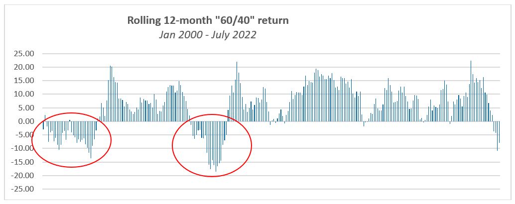 - There was a 24% and 76% probability of receiving a negative and positive return respectively over the rolling 12-month periods from Jan 2000 to July 2022.