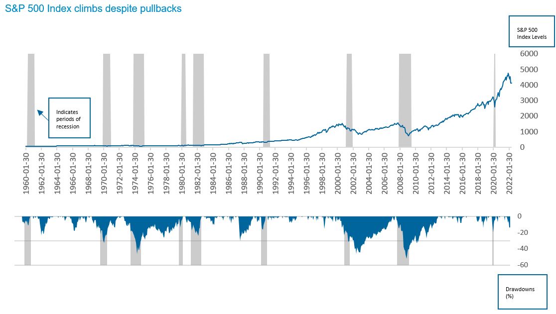 The technical definition of a bear market is a drawdown of at least 20% in a stock market index from its most recent high. The S&P 500 Index briefly entered bear market territory on May 20, 2022, before reversing course. The Nasdaq Index also entered bear market territory in recent months. Of note, while bear markets are synonymous with strongly negative sentiment around equities, it is not uncommon for the market to see significant drawdowns on its way toward generating longer-term gains.