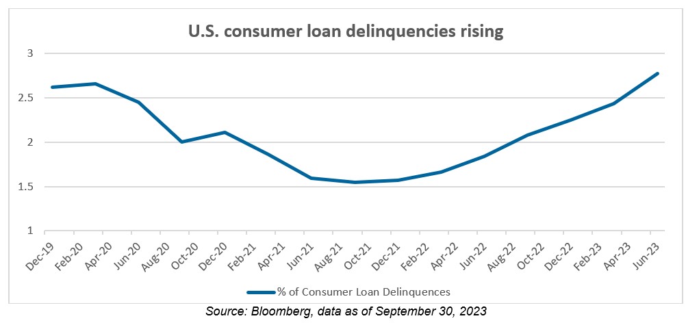 There is growing evidence that suggests that consumption will slow as well. The excess savings that have largely been responsible for the resilience of consumers is expected to be mostly depleted by the end of the year, and as this buffer erodes, consumer spending will begin to slow down. Additionally, with the resumption of student loan repayments, consumers are starting to feel the squeeze. With an uptick in credit card and auto loan delinquencies, the resilience of consumers is starting to wane, and they will be less of a tailwind to economic growth going forward.
