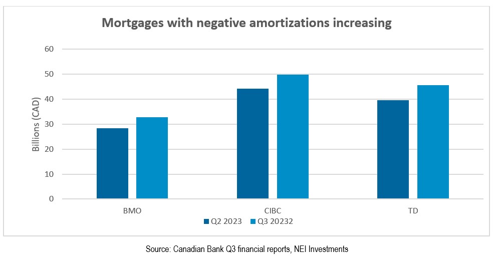Statistics from big Canadian banks' Q3 2023 earnings reports show that negative amortizations make up 22% of BMO’s total mortgage portfolio, 19% of CIBC’s total mortgage portfolio and 18% of TD’s mortgage portfolio, but minimally in RBC and Scotiabank. Mortgages with negative amortizations have been rising alarmingly during the last quarter. This could lead to the continuation of weaker consumer spending in Canada so long as the monetary policy stays restrictive.