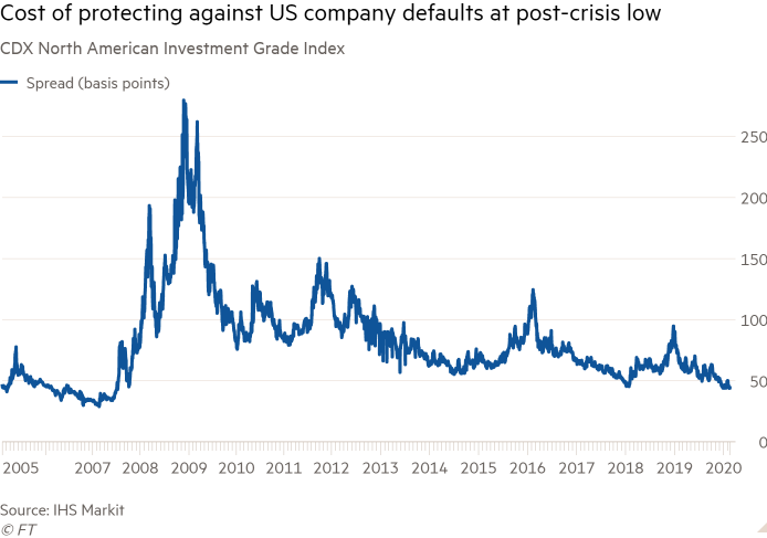 The CDX North American Investment Grade index, which reflects the cost of default protection on bonds issued by 125 US companies, fell to 43.81 basis points last week, implying a premium of $4.38 to insure a $1,000 portfolio of bonds. That was its lowest level since July 2007, according to index provider IHS Markit. The index has since nudged higher to 44.62bp but remains near historic troughs.