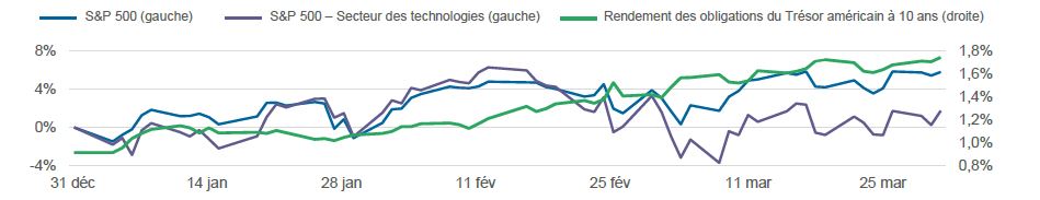 Le cours d’une action est généralement déterminé en tenant compte de tous les flux de trésorerie positifs futurs que devrait générer une société et en « actualisant » ces flux à une valeur globale actuelle. La valeur d’un dollar en flux de trésorerie sera plus élevée aujourd’hui que dans 10 ans. Mais de combien baisse cette valeur au fil du temps? À un niveau très élémentaire, les investisseurs peuvent utiliser le taux sans risque pour calculer la valeur actuelle des flux de trésorerie futurs. Plus le taux sans risque est élevé, plus la valeur actuelle d’un dollar futur est faible. Plus l’horizon temporel est long, plus l’incidence des variations du taux sans risque est grande. Les entreprises technologiques et autres sociétés à forte croissance, dont une plus grande partie des flux de trésorerie est générée dans les années subséquentes (sur 10 ans ou plus), sont donc plus sensibles aux hausses des taux d’intérêt. Ce phénomène fonctionne dans les deux sens : quand les rendements obligataires ont baissé l’an dernier au début de la pandémie, ce sont les titres technologiques qui menaient la reprise.