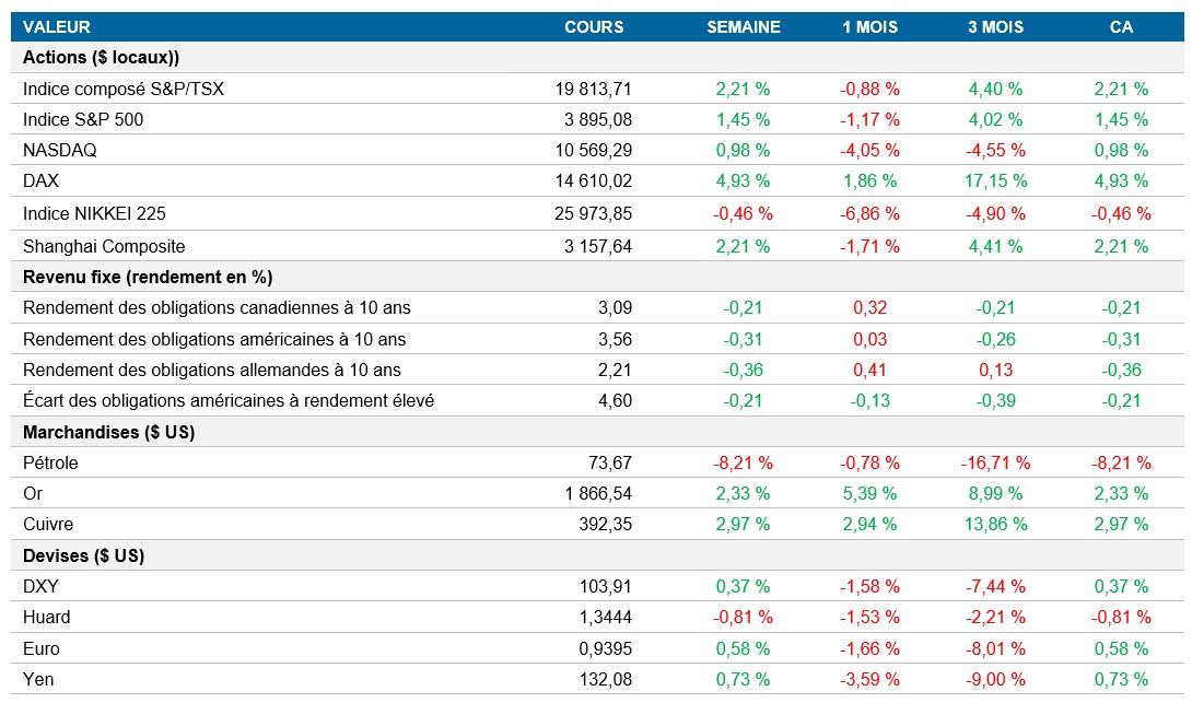 Titres à revenu fixe : Les taux obligataires ont reculé vendredi, le taux à 10 ans clôturant la semaine à 3,56 % (en baisse de 0,31 % par rapport à il y a une semaine), alors que les investisseurs analysaient les données contrastées sur la main-d’œuvre et l’inflation salariale. Même si les salaires augmentent moins que prévu, le marché de l’emploi demeure serré et le marché estime que les taux de la Fed pourraient culminer à environ 5 % cette année.