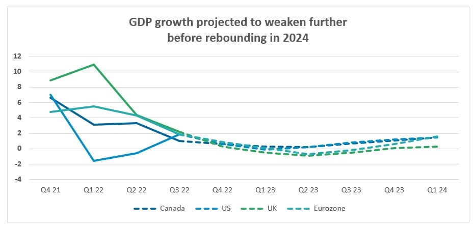 Central Banks decelerating rate hikes but may take longer to get to their peak as oversized rate hikes maybe coming to an end. Policy leaders may take a more cautious approach going forward as they analyze how higher rates are impacting different parts of the economy. A slower pace of tightening may result in a longer journey to peak rates.