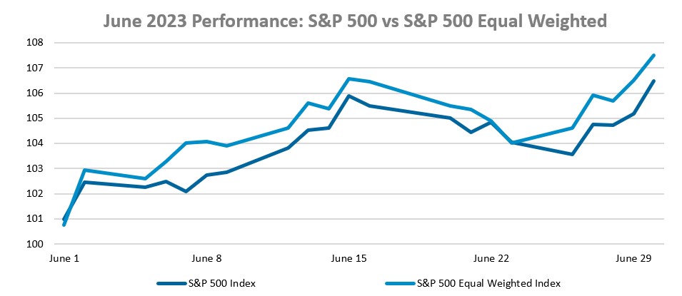 The S&P 500 Index broke out of its 3800-4200 trading range and entered a technical bull market after returning over 24%since hitting a low in October. While the performance of AI exposed mega-cap technology companies has led the markets, the rally has recently broadened with the equal-weighted index outperforming the market-weighted index in June, pointing to an improvement in breadth and potential for continued upside.