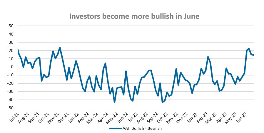 Market strength buoys investment sentiment as market sentiment has shifted from having more investors in the bearish camp, to having the majority of investors turning bullish over the past few months. In June, bullish sentiment was at its highest level since November 2021.