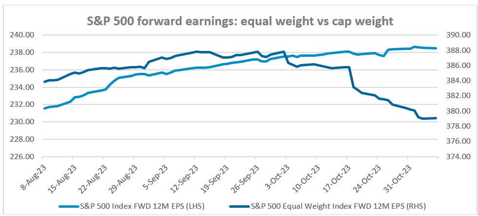 Looking at the market as a whole, on a market cap weighted basis, the earnings estimates are expected to grow over the next 12 months, while on an equal weighted basis, there is an expected decline in earnings, which indicates that for the largest companies, earnings expectations are very strong relative to the rest of the market.