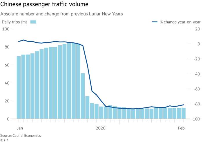 BigOne’s insights point to slow progress in bringing businesses back online. In early February, for example, 83 per cent of about 1m restaurants tracked on Meituan-Dianping, China’s biggest delivery platform, remained closed. As of February 14, services were still suspended at 87 per cent of roughly 5,500 outlets operated by Luckin Coffee, China’s rival to Starbucks.