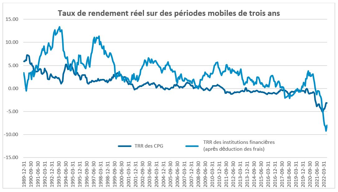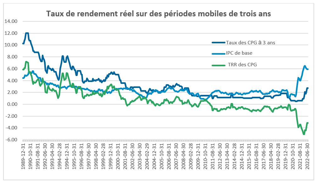 L’avantage le plus important d’un placement dans un CPG est le « remboursement du capital ». Les CPG sont garantis par la Société d’assurance-dépôts du Canada (SADC) ou par les régimes d’assurance-dépôts provinciaux des coopératives d’épargne et de crédit. Toutefois, la certitude de se faire rembourser le capital a un prix, soit un taux de rendement réel négatif. Le graphique suivant montre que l’érosion du capital corrigé de l’inflation n’a jamais été aussi marquée en plus de 40 ans.