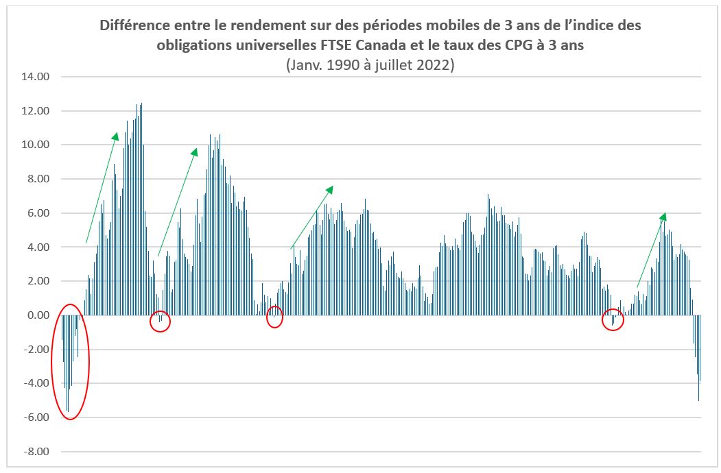 Depuis avril 2022, les rendements de la catégorie des titres à revenu fixe sur des périodes mobiles de trois ans ont glissé en territoire négatif pour la première fois en plus de quatre décennies. Pour de nombreux investisseurs, ce rendement médiocre a renforcé l’attrait relatif des CPG (certificats de placement garanti), dont les taux ont augmenté, ce qui est conforme au cycle général de hausses des taux amorcé par la Banque du Canada. Les investisseurs peuvent aujourd’hui investir dans des CPG à 3 ans offerts à des taux moyens de 2 % à 3 %, voire de 4 % à 5 %.