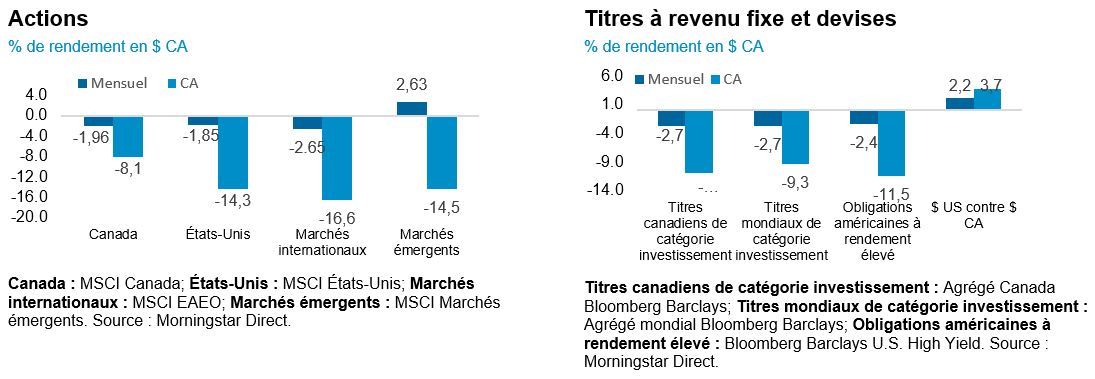 Le mois d’août s’est déroulé en deux temps : les pressions sur les prix se sont atténuées au cours des deux premières semaines, soutenant ainsi les actions, mais le marché s’est essoufflé au milieu du mois, car le discours des banques centrales – favorable à un resserrement monétaire – a ravivé les craintes de récession. Vu le resserrement des conditions financières et la probabilité croissante de récession, le rendement de toutes les grandes catégories d’actif (actions, obligations, produits de base, titres de créance à rendement élevé, etc.) a glissé en territoire négatif, de sorte que les investisseurs n’ont nulle part où se réfugier. Le dollar américain a été la seule valeur refuge, car il s’est apprécié par rapport à la plupart des devises.