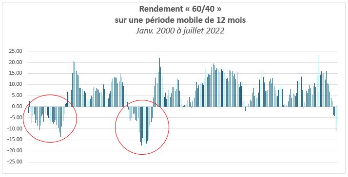 - La probabilité d’enregistrer un rendement négatif et positif était de 24 % et de 76 %, respectivement, sur les périodes mobiles de 12 mois de janvier 2000 à juillet 2022.