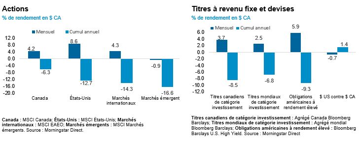 L’appétit pour le risque a augmenté en juillet, les actions ayant récupéré certaines de leurs pertes cumulatives depuis le début de l’année, notamment dans le segment de croissance du marché. Les actions ont généralement surpassé les obligations au cours du mois. L’appétit pour les actifs à risque a été stimulé par les attentes du marché selon lesquelles la Réserve fédérale américaine (la « Fed ») pourrait devoir ralentir son cycle de relèvement des taux, en raison des conditions financières déjà resserrées. Ces opinions ont été exprimées sur le marché des obligations à terme, lequel a fait l’objet d’une importante réévaluation depuis la mi‑juin, car on s’attend actuellement à ce que la Fed ne puisse pas relever les taux de façon significative au-dessus du taux neutre.