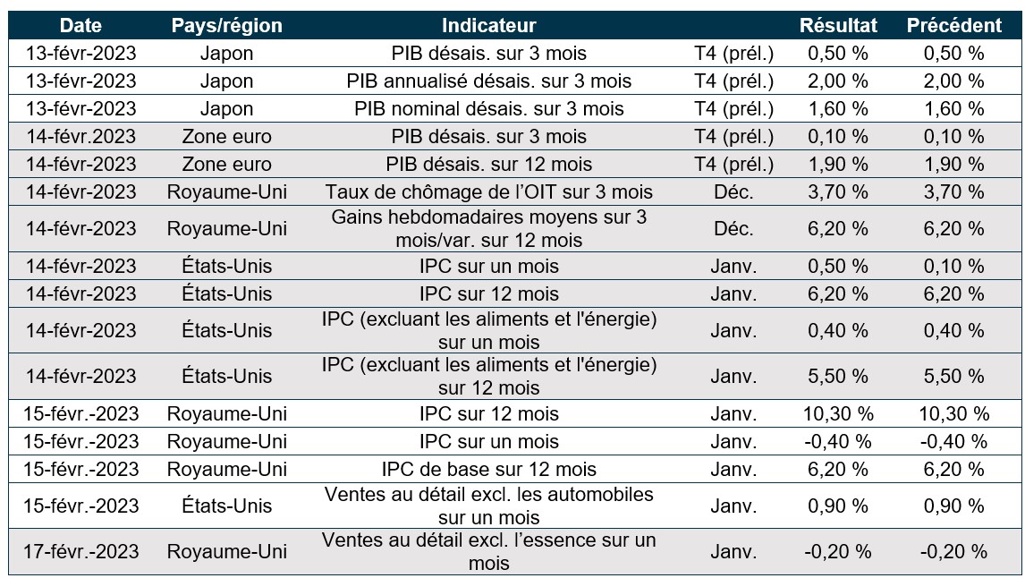 Actions : Le marché américain a reculé de plus de 1 % cette semaine, principalement en raison des ventes massives dans le secteur des technologies, alors que certains porte-parole de la Fed ont réitéré la possibilité que les taux d’intérêt augmentent et restent élevés plus longtemps. Les bénéfices du quatrième trimestre continuent de dépasser les attentes, même si les prévisions de bénéfices pour 2023 sont revues à la baisse et laissent entrevoir une croissance faible ou nulle cette année. Les résultats les plus remarquables ont été ceux de Disney, dont le titre a bondi après l’annonce de réductions de coûts et de mises à pied importantes sous la direction de Robert Iger, qui est redevenu le chef de la direction de la société en novembre. Tous les yeux seront rivés sur le chiffre de l’IPC la semaine prochaine pour voir si le cycle de resserrement de la Fed a contribué à réduire l’inflation.