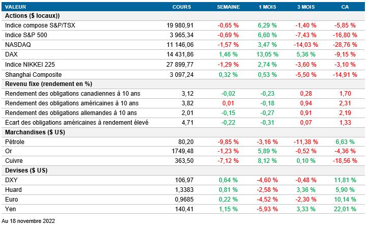Pouls hebdomadaire des marchés - Semaine se terminant le 18 novembre 2022