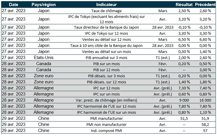 Actions : Les actions américaines ont terminé la semaine en légère baisse, les investisseurs évaluant les résultats de bénéfices contrastés et les données sur l’activité commerciale aux États-Unis et attendant les résultats des grandes sociétés technologiques la semaine prochaine pour juger de la santé financière des sociétés américaines. Les récentes données de l’indice PMI ont augmenté de façon inattendue ce mois-ci, atteignant presque leur plus haut niveau en un an, propulsées par le raffermissement des secteurs des services et de la fabrication, qui pourrait raviver les pressions inflationnistes. La résilience des bénéfices aux États-Unis, notamment ceux de HCA Healthcare et de Procter & Gamble, a aidé les actions à maintenir leurs gains depuis le début de l’année, alors que les résultats d’une série de sociétés technologiques à mégacapitalisation, dont Alphabet, Meta Platforms et Amazon, sont attendus la semaine prochaine.