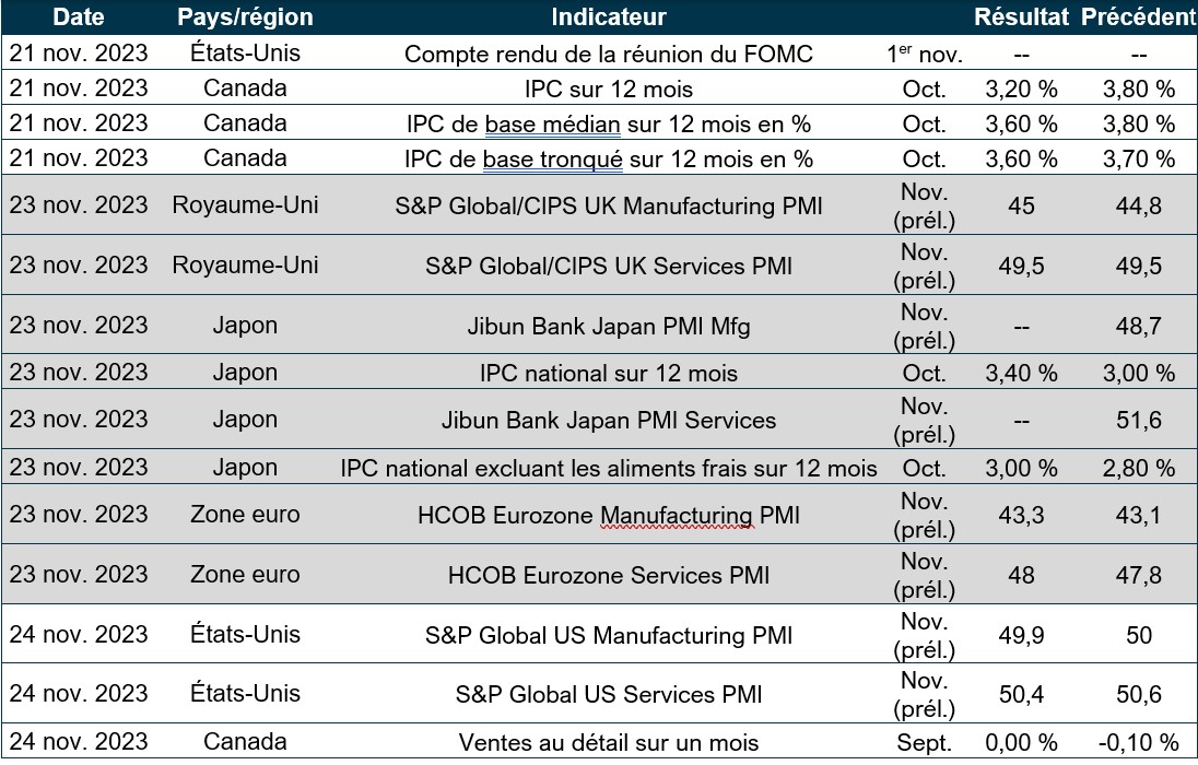 Actions : Après une remontée de 2 700 G$ en novembre, alimentée par les rumeurs que la Réserve fédérale pourrait mettre fin à son cycle haussier, l’indice S&P 500 se négocie maintenant au-dessus de 4 500 points et a enregistré une troisième semaine de gains consécutive. Malgré sa récente consolidation, il pourrait se replier à court terme, l'accroissement des valorisations des titres de grande qualité étant traditionnellement associée à des périodes de turbulences. La saison des bénéfices prend fin sur une hausse de 4 % sur 12 mois, ce qui met potentiellement un terme à une séquence de trois trimestres de baisse, et l’attention se porte maintenant sur les résultats à venir des détaillants et des sociétés technologiques comme Best Buy, Nordstrom, Lowe’s et Nvidia.