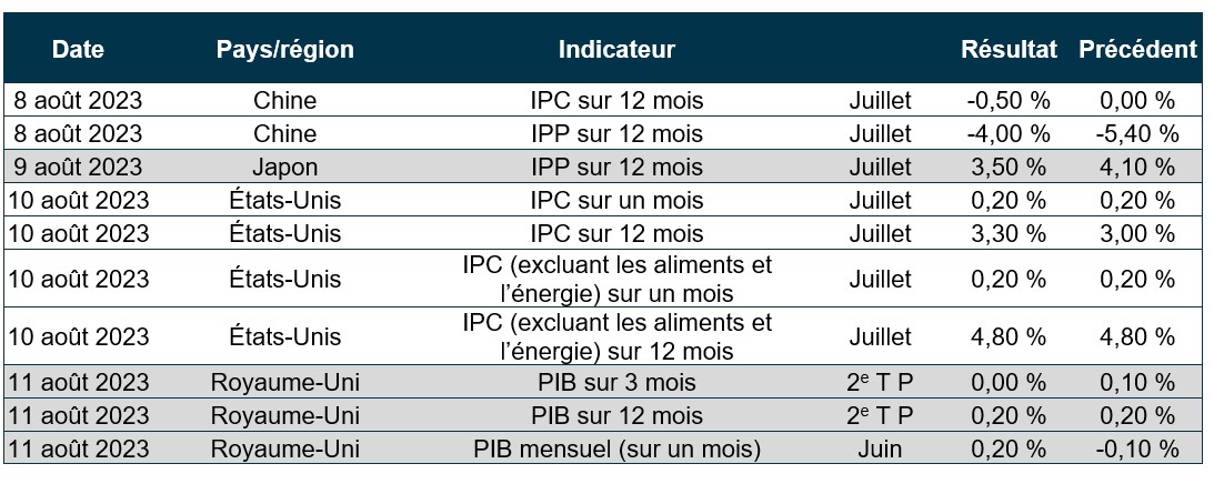 Actions : Les actions américaines ont clôturé la semaine avec des résultats contrastés, l’indice S&P 500 oscillant. Les géants des technologies ont déclaré des bénéfices contrastés, ce qui a miné la confiance des investisseurs. Les préoccupations à l’égard de la stabilité budgétaire et de la hausse des taux obligataires ont également pesé sur la confiance des investisseurs. Un rapport favorable sur l’emploi a alimenté les spéculations au sujet de la décision que la Réserve fédérale américaine (la « Fed ») prendra en septembre concernant les taux d’intérêt, ce qui a accru l’incertitude sur les marchés.
