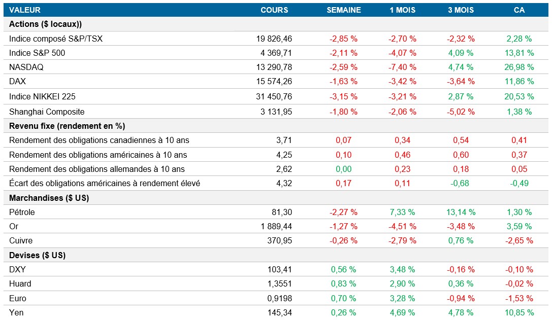 Actions : Les marchés boursiers ont subi un important repli, car les craintes d’une hausse des taux d’intérêt ont ébranlé la confiance, plombant les principaux indices vers leur plus forte perte hebdomadaire depuis mars. Les indices S&P 500 et MSCI Monde ont continué de reculer, les indices de référence américains et mondiaux étant en voie d’enregistrer l’un des pires rendements hebdomadaires depuis l’incident de la Silicon Valley Bank. Le Nasdaq a reculé de 2,6 %, déclinant davantage que l’indice S&P 500 (-2,1 %), les actifs risqués ayant fait l’objet d’un délestage généralisé.