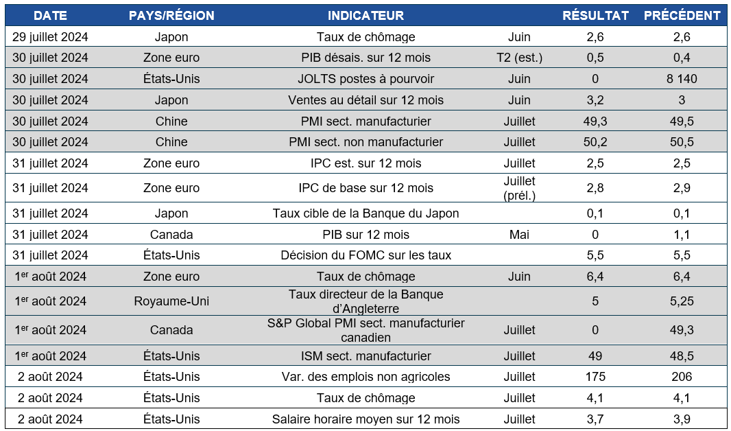 Titres à revenu fixe : La réduction de 25 pb de la Banque du Canada (BdC) cette semaine, conjuguée aux attentes accrues d’une troisième réduction cet automne, a contribué à la baisse des taux de rendement des obligations gouvernementales à court terme. Du côté des États-Unis, les négociateurs misent sur une baisse de taux en septembre, ce qui devrait favoriser l’économie sans signaler un ralentissement marqué.