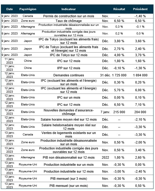 Le taux de chômage aux États-Unis a chuté à 3,5 % en décembre, ce qui est inférieur à la prévision de 3,7 %. Le rapport sur l’emploi du mois de décembre fait suite à une baisse marquée des nouvelles demandes hebdomadaires d'assurance-chômage (204 000 comparativement aux attentes du marché de 225 000), qui dénote un marché de l’emploi vigoureux, qui pourrait contribuer à maintenir les taux d’intérêt plus élevés plus longtemps. Aux États-Unis, 223 000 emplois ont été créés en décembre, ce qui est supérieur aux estimations du marché de 200 000, tandis que l’inflation salariale moyenne sur 12 mois a chuté à 4,6 %, bien en deçà des prévisions de 5 %.